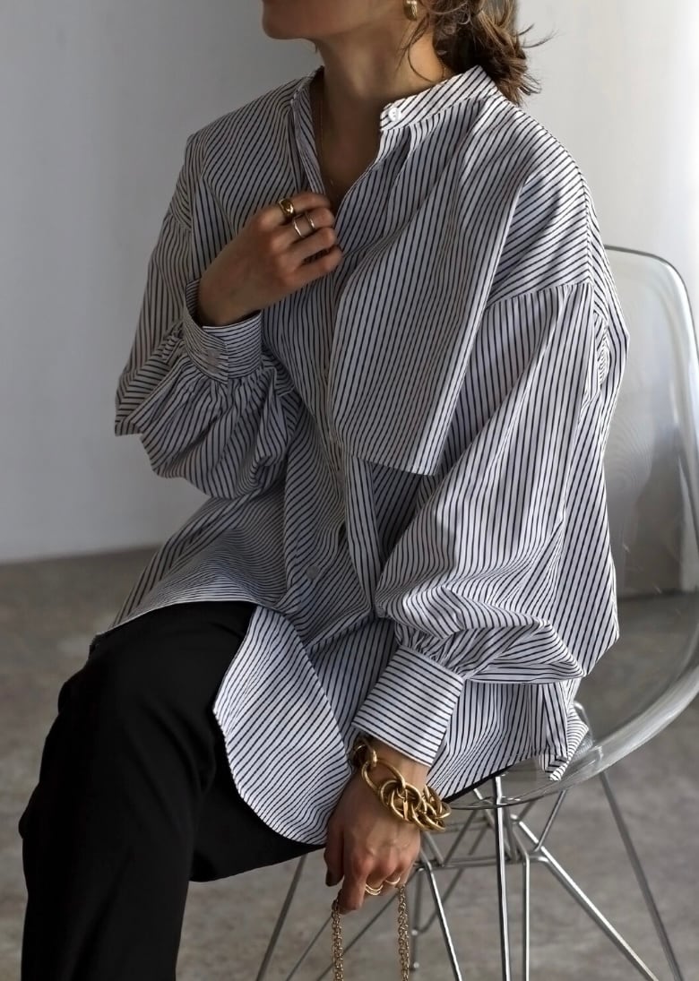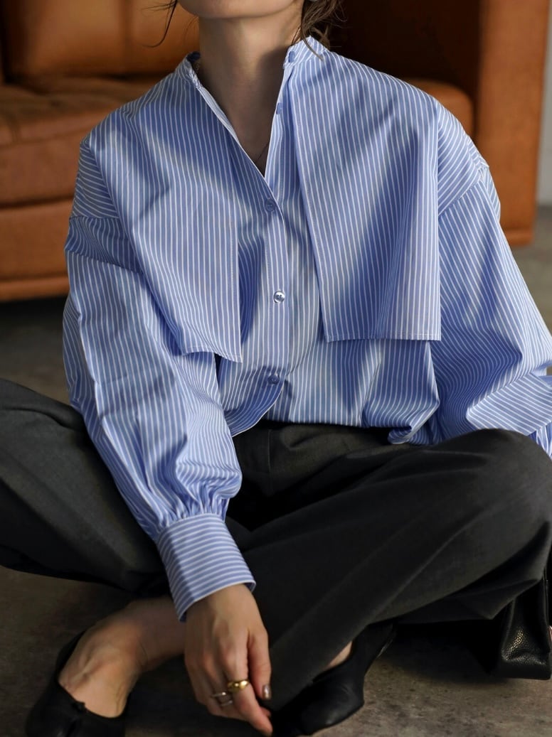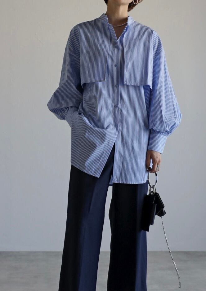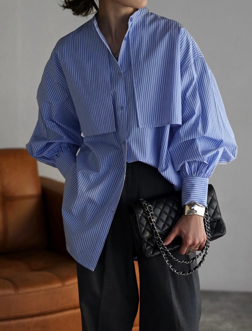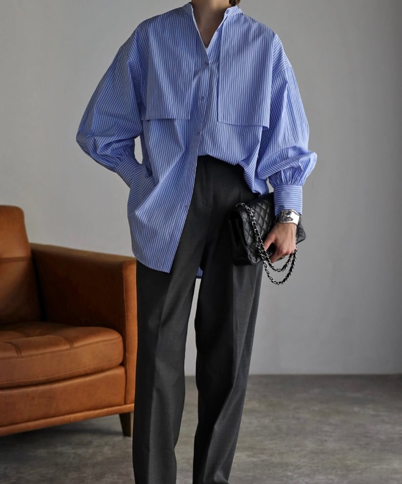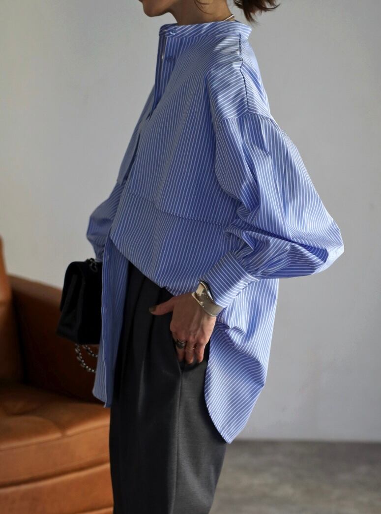 爽やかな印象のストライプ柄とバンドカラーデザインは、オールシーズンご着用していただけます。