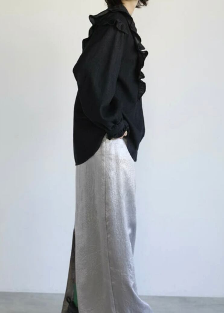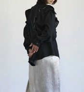 ライトオンスデニムのフリルシャツは、インディゴはケミカル加工、ブラックはワンウォッシュ仕上げの異なる風合いが魅力。前後に施された立体的なフリルが印象的で、デニム特有のヴィンテージ感がコーディネートに深みをプラスします。