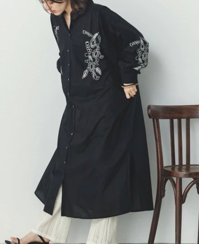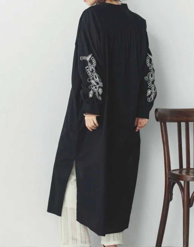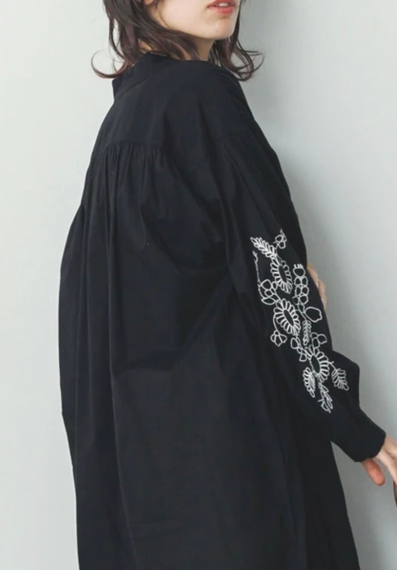 袖にも刺繍を施しアクセントに。衿元はバンドカラーですっきりとした印象です。