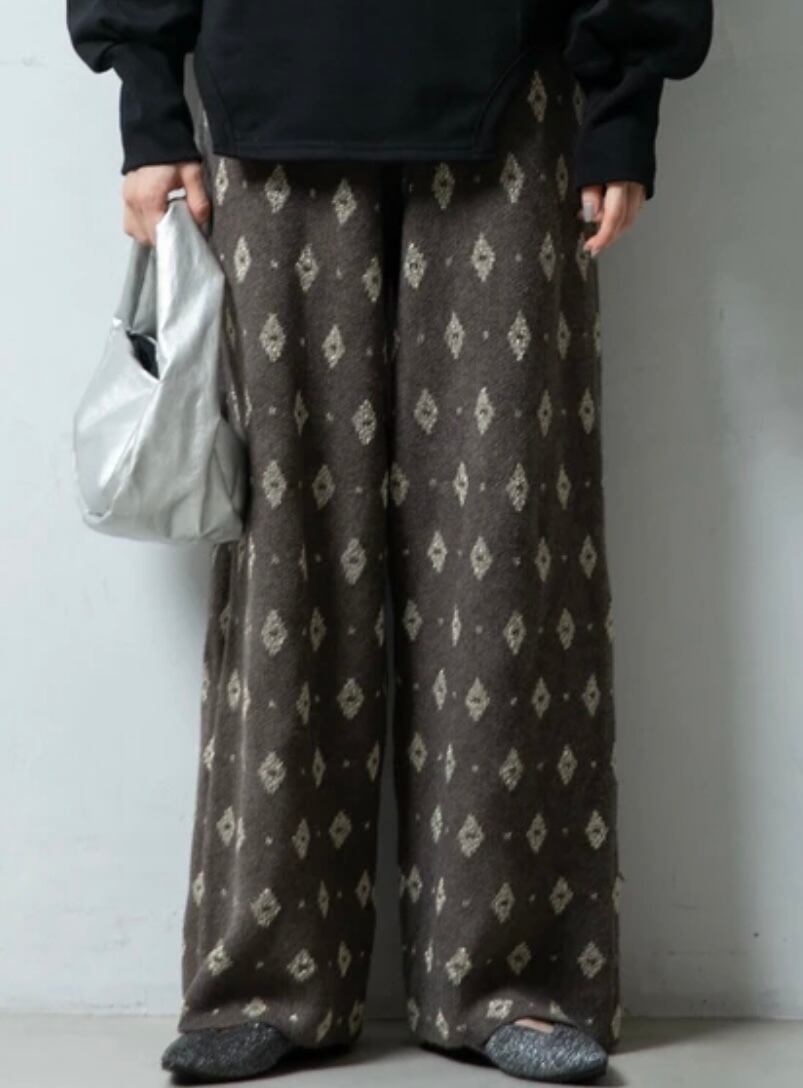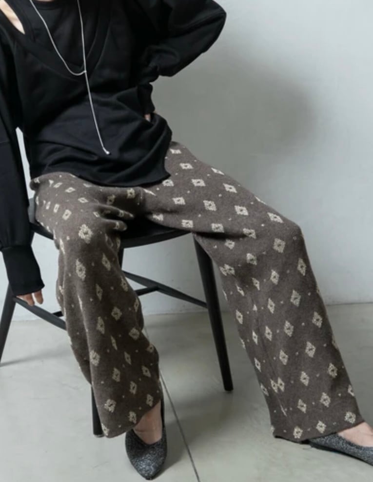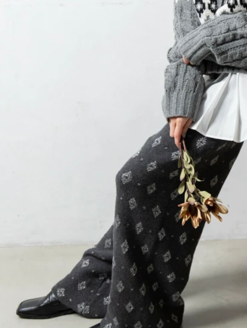 繊細なラメ糸とダイヤ柄のジャガード織りが特徴の、華やかでドレッシーなイージーパンツです。無地のトップスと合わせるだけで、特別感のある着こなしが完成します。