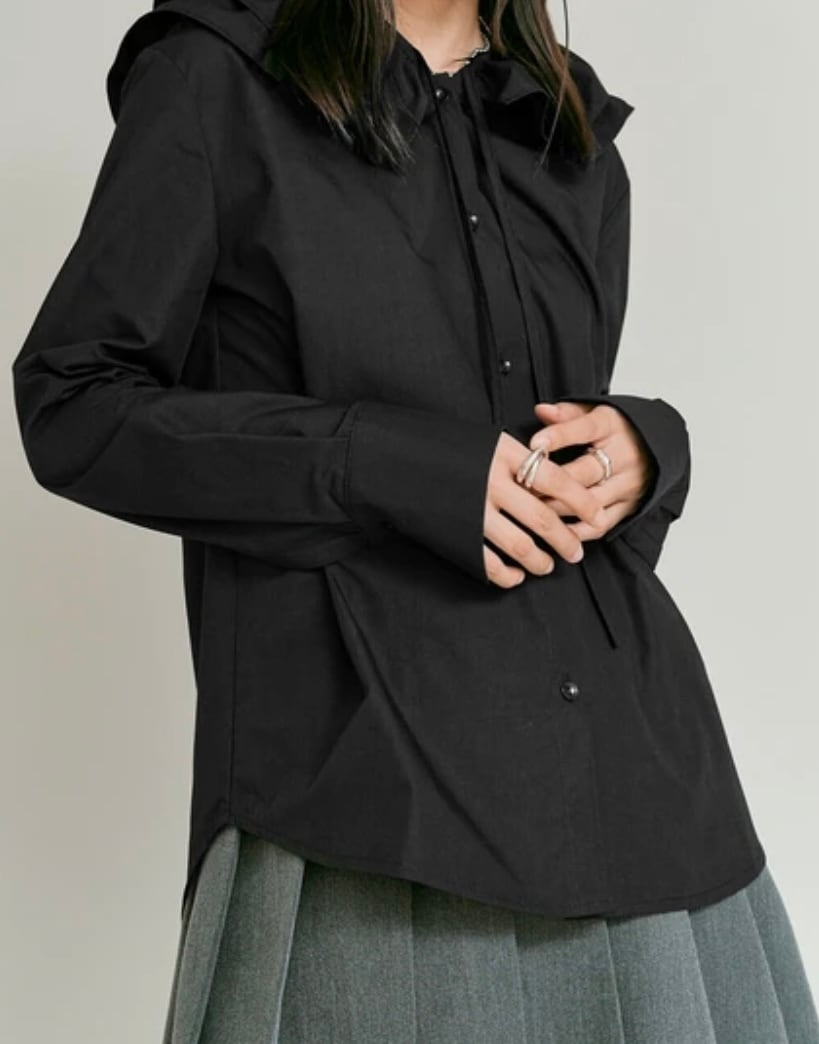 フリル襟のようなフードが特徴的な、華やかノンアイロンブラウス。