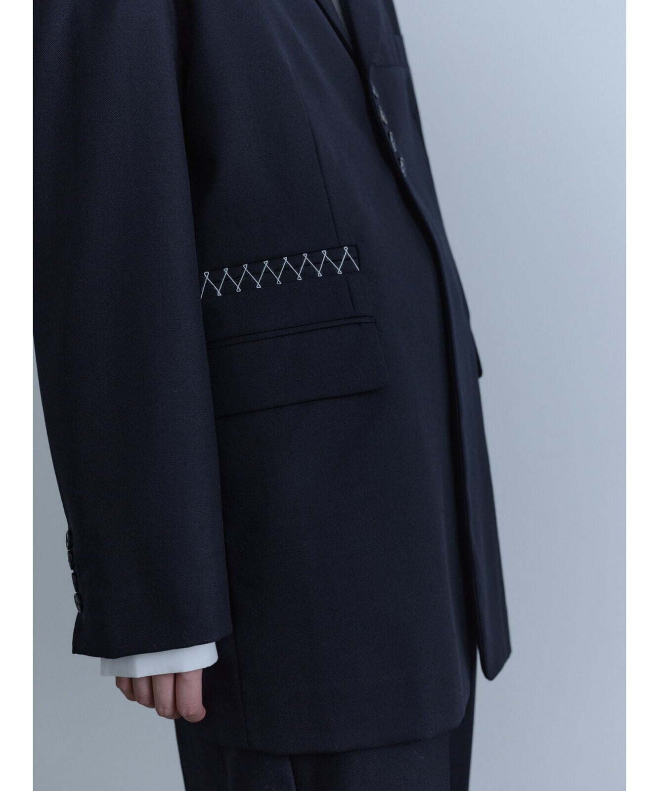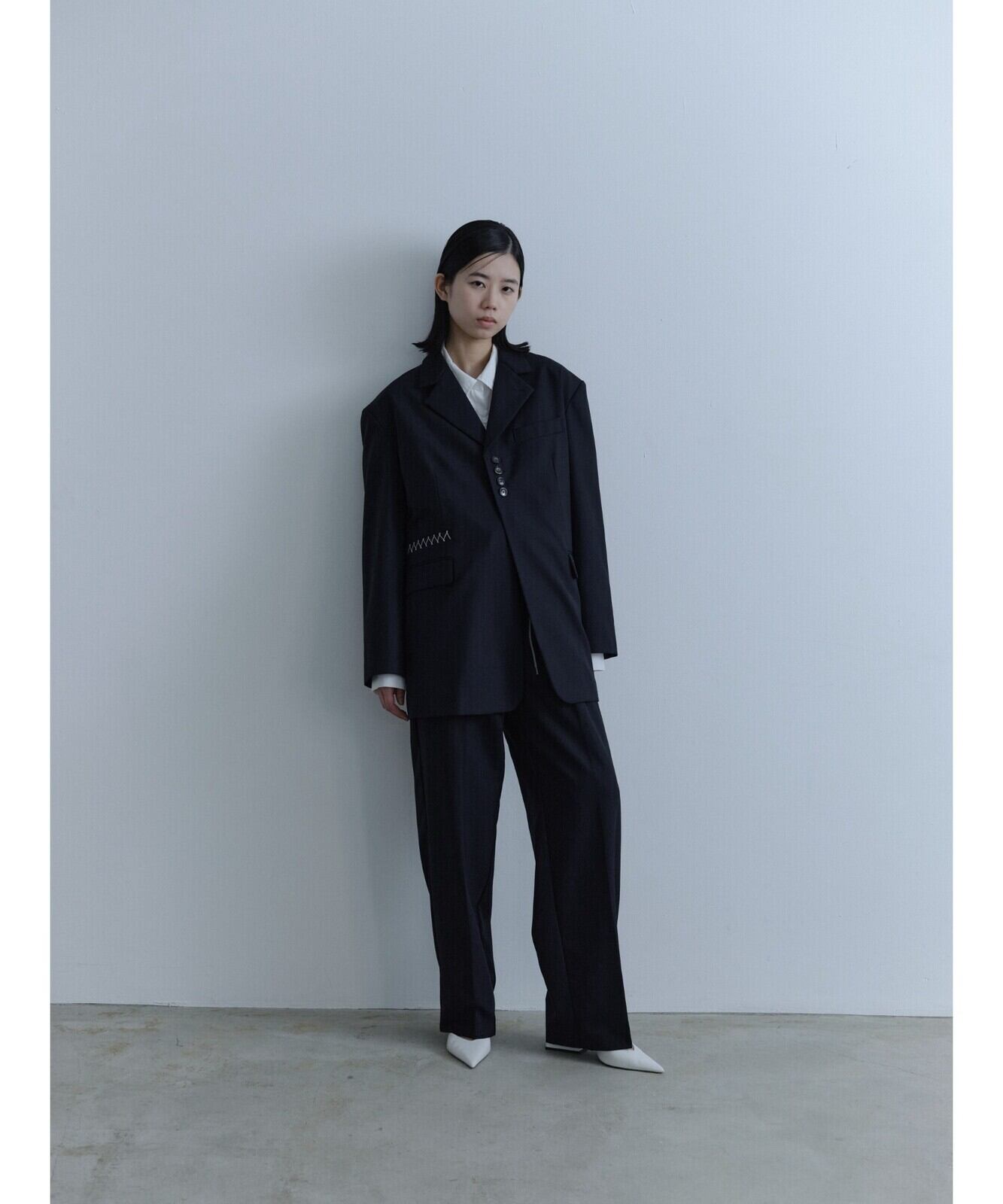 マスキュリンで表情が綺麗なウール混のスーツ地に対してカジュアルなスウェット生地の