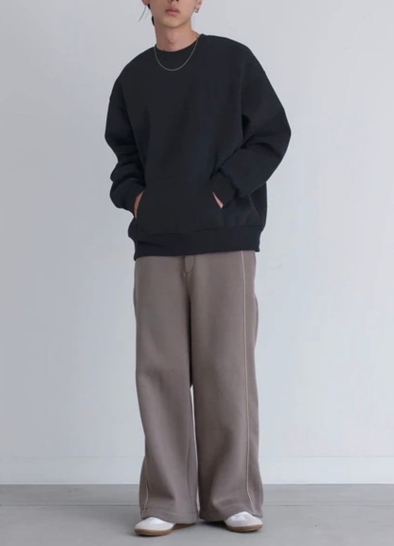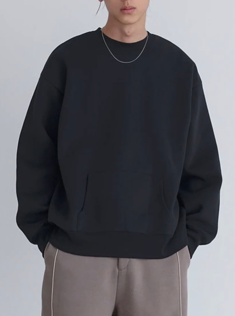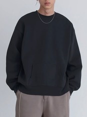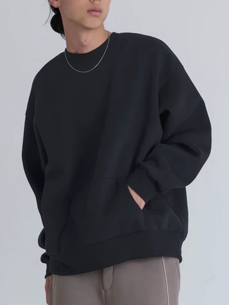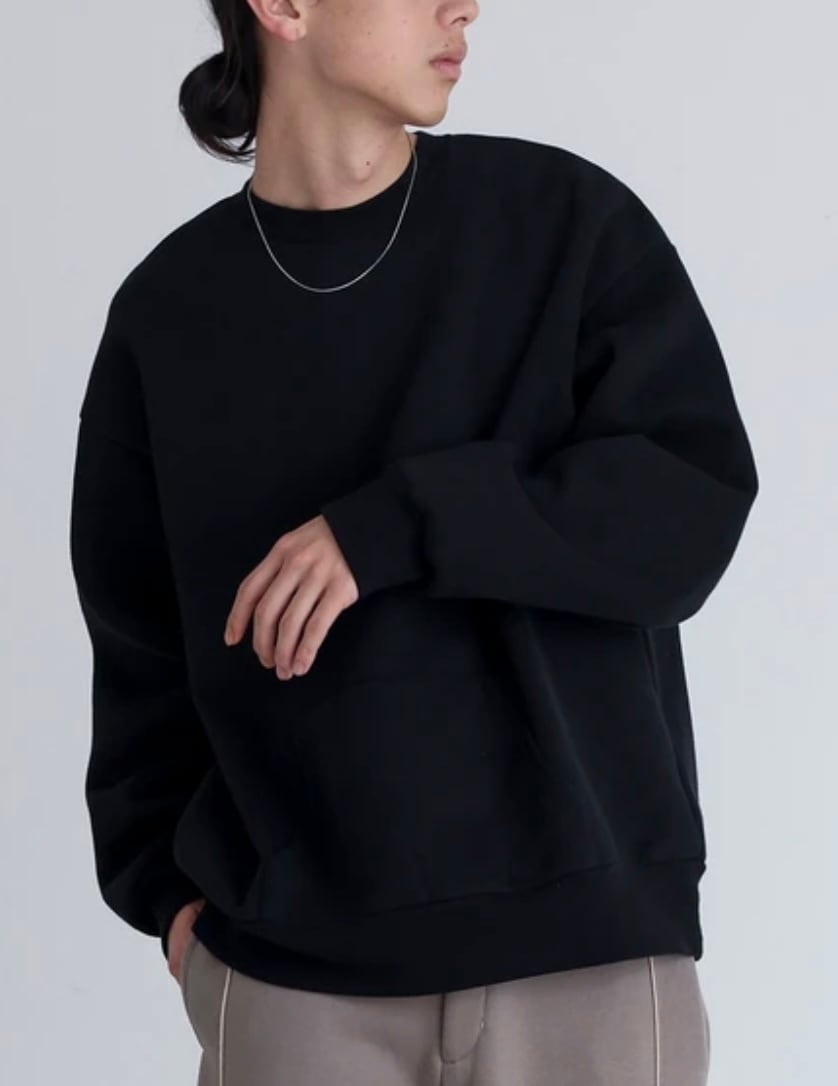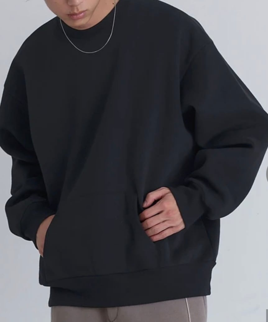 前身頃のアクセントになるカンガルーボケットと、スッキリとしたデザインのクルーネックがポイント。
