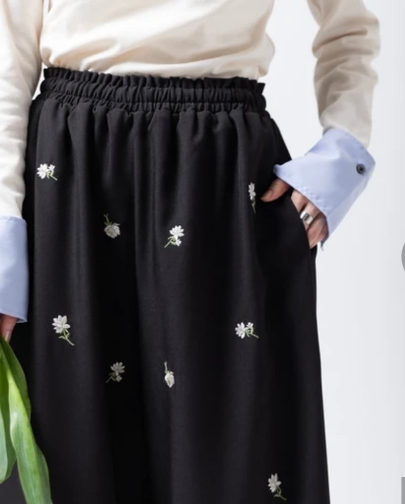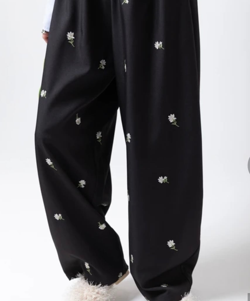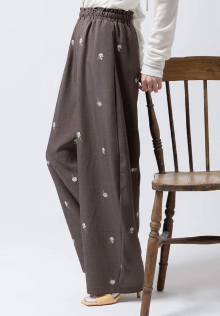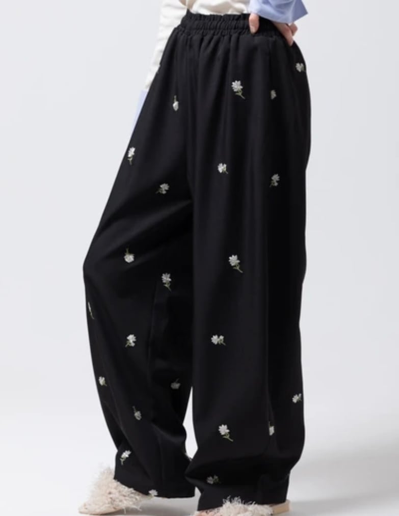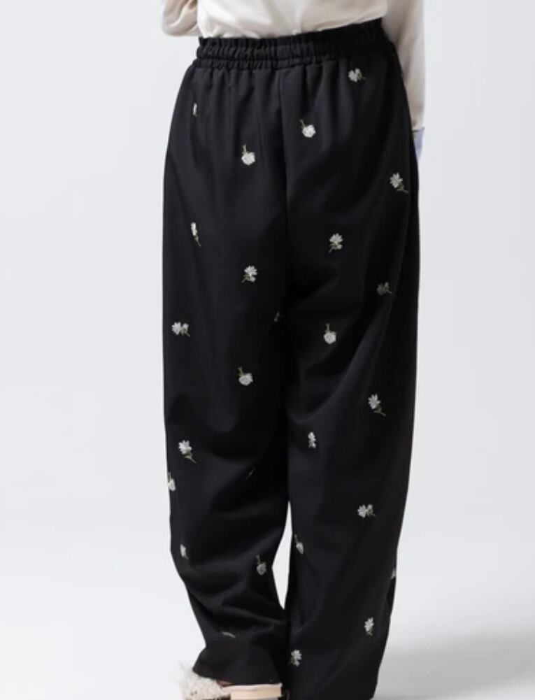 全体に施された繊細な小花柄刺繍が目を惹く、存在感抜群のイージーパンツです。