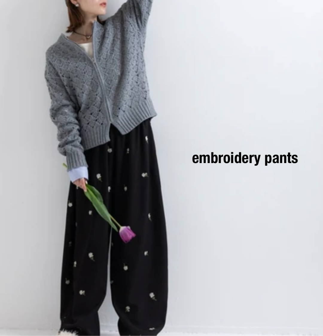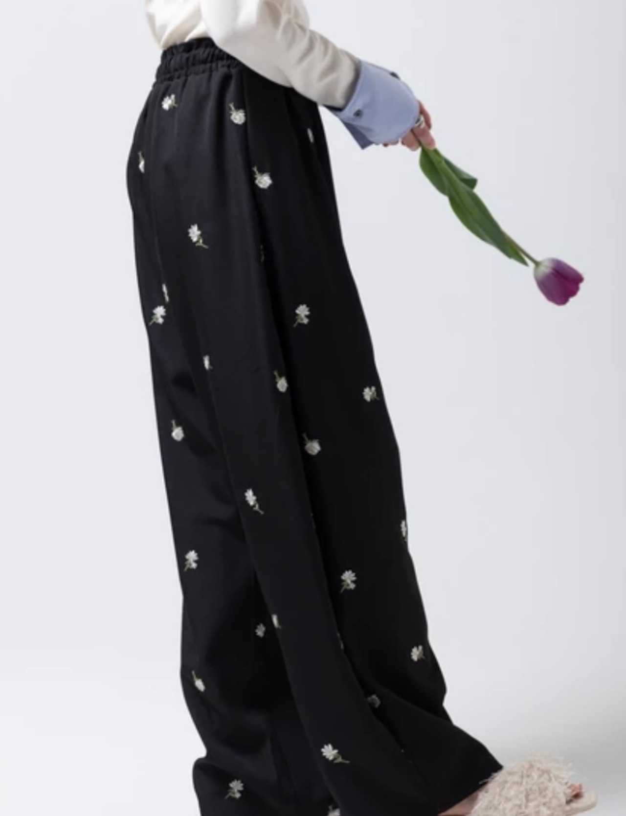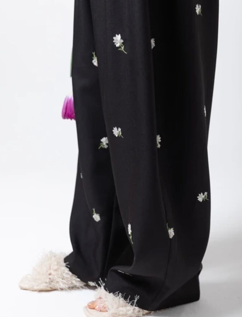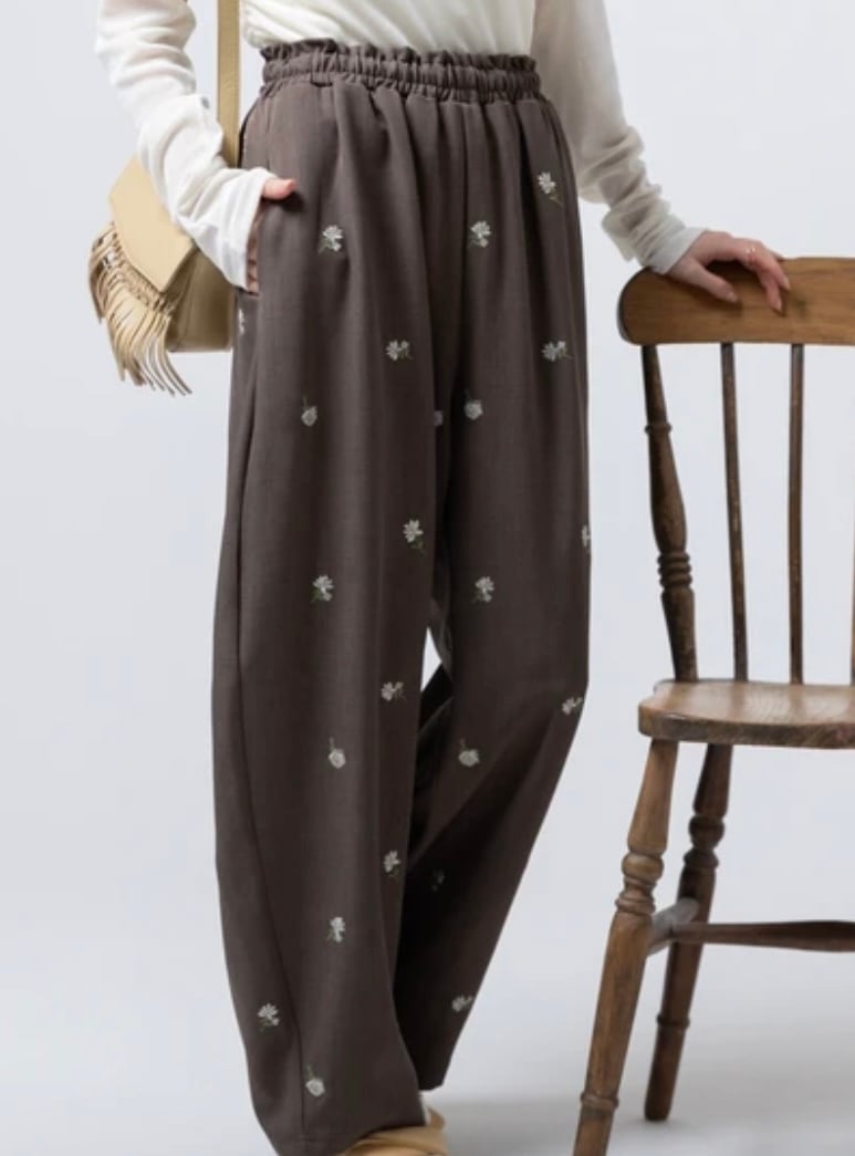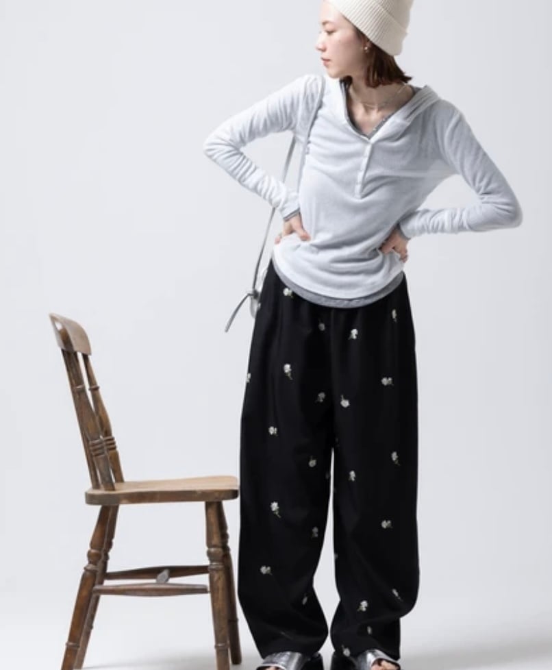 全体に施された繊細な小花柄刺繍が目を惹く、存在感抜群のイージーパンツです。