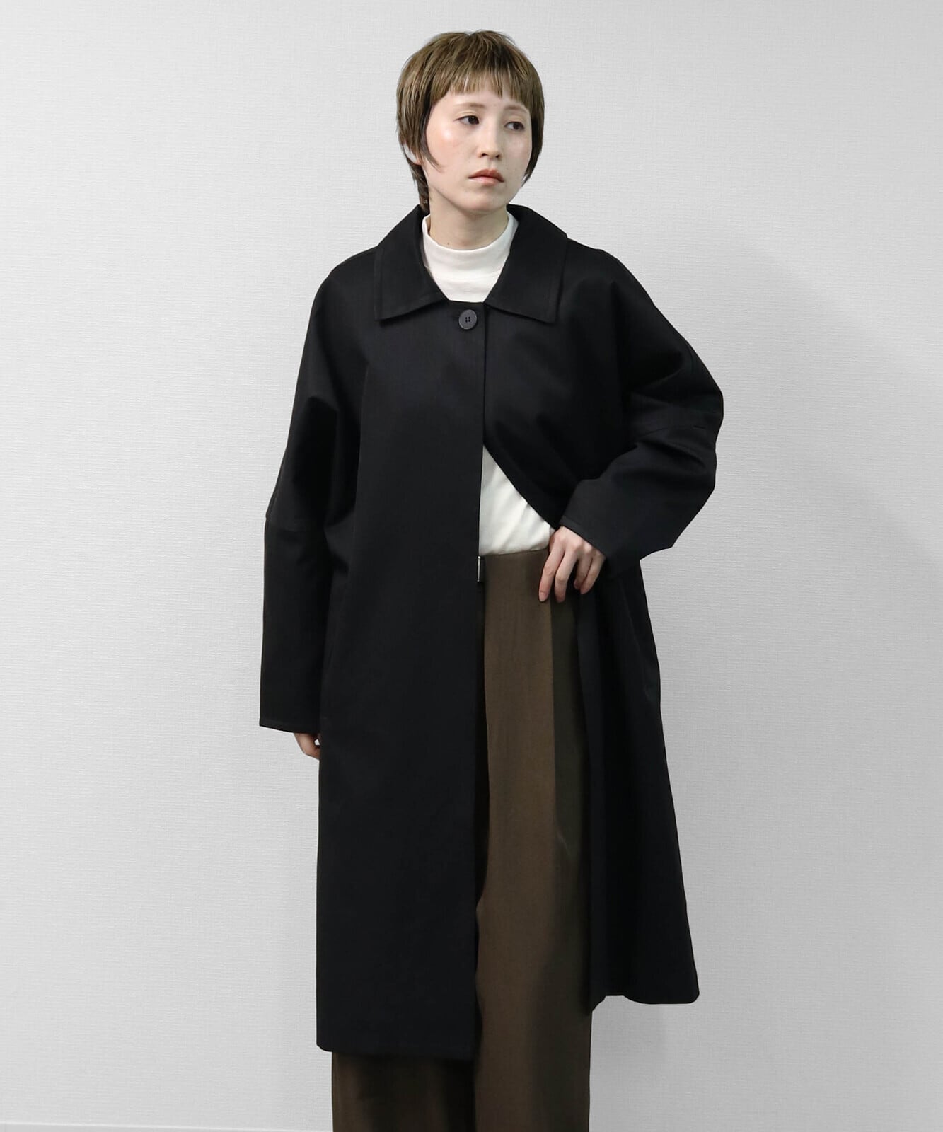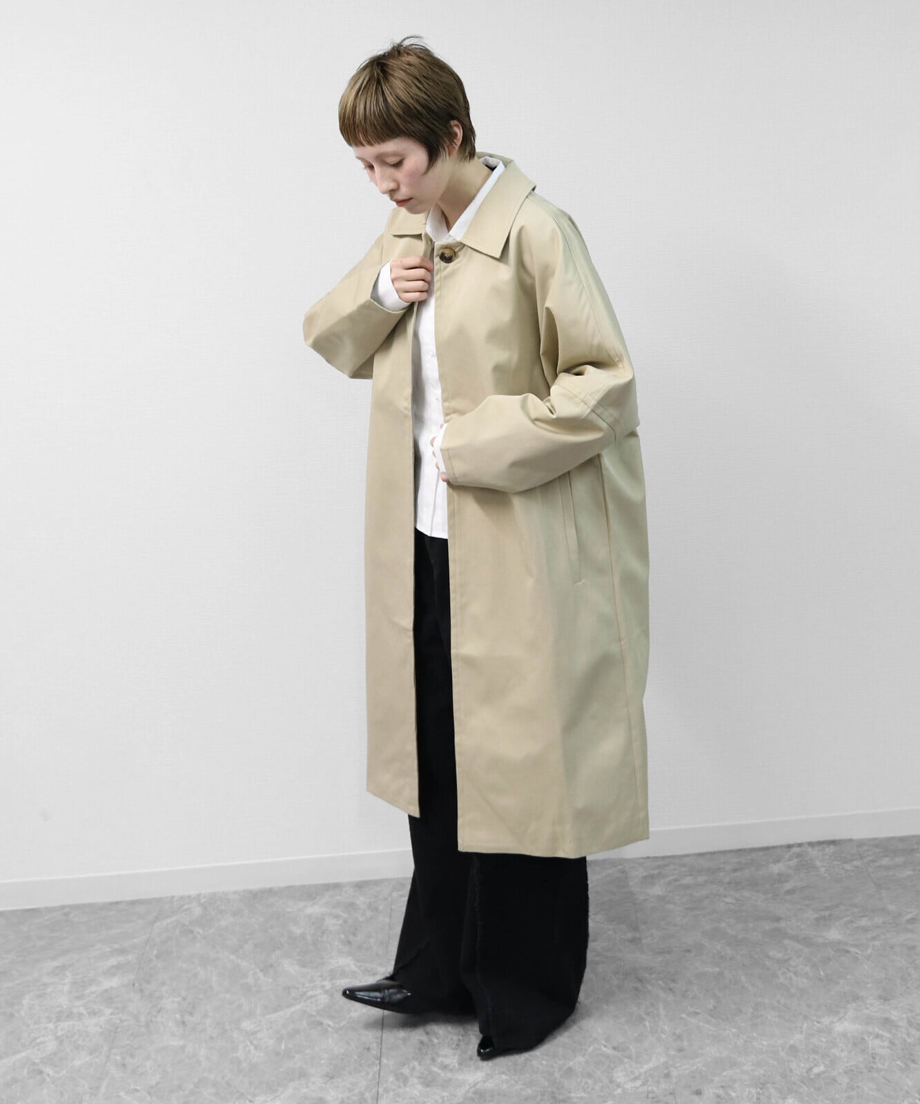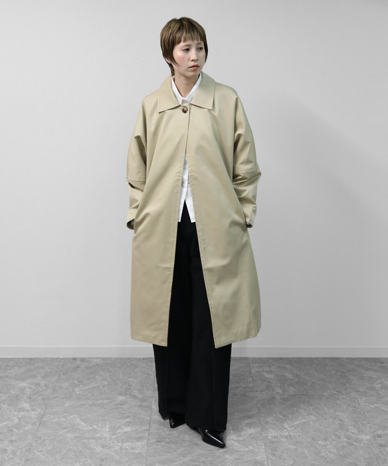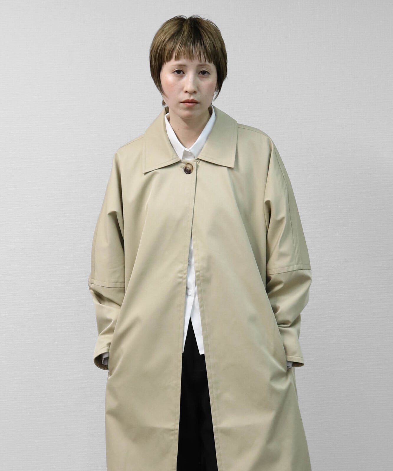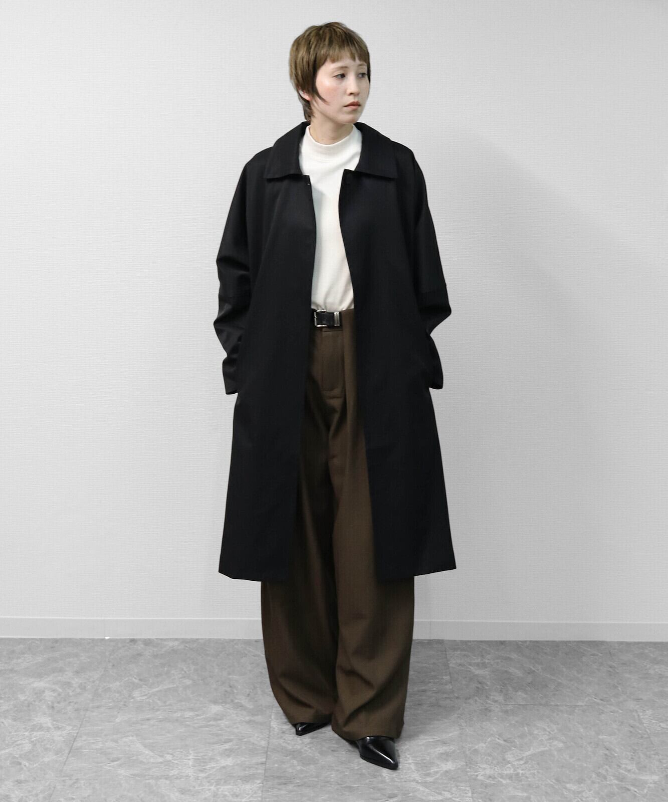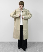 ゆったりとしたドルマンスリーブが生む立体感が、トレンチコートにやさしい表情を添えています。