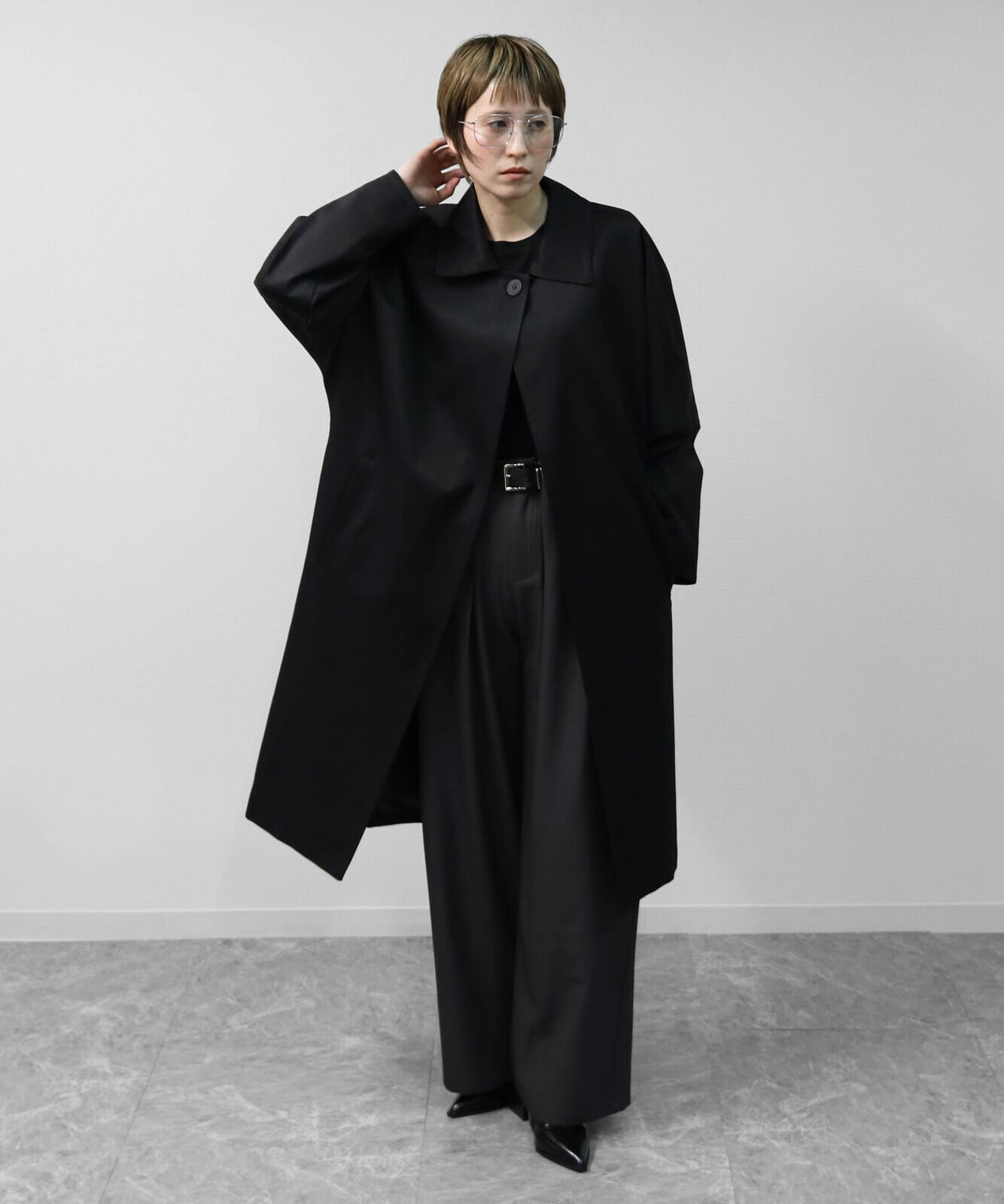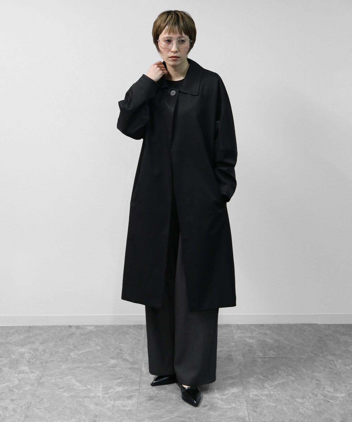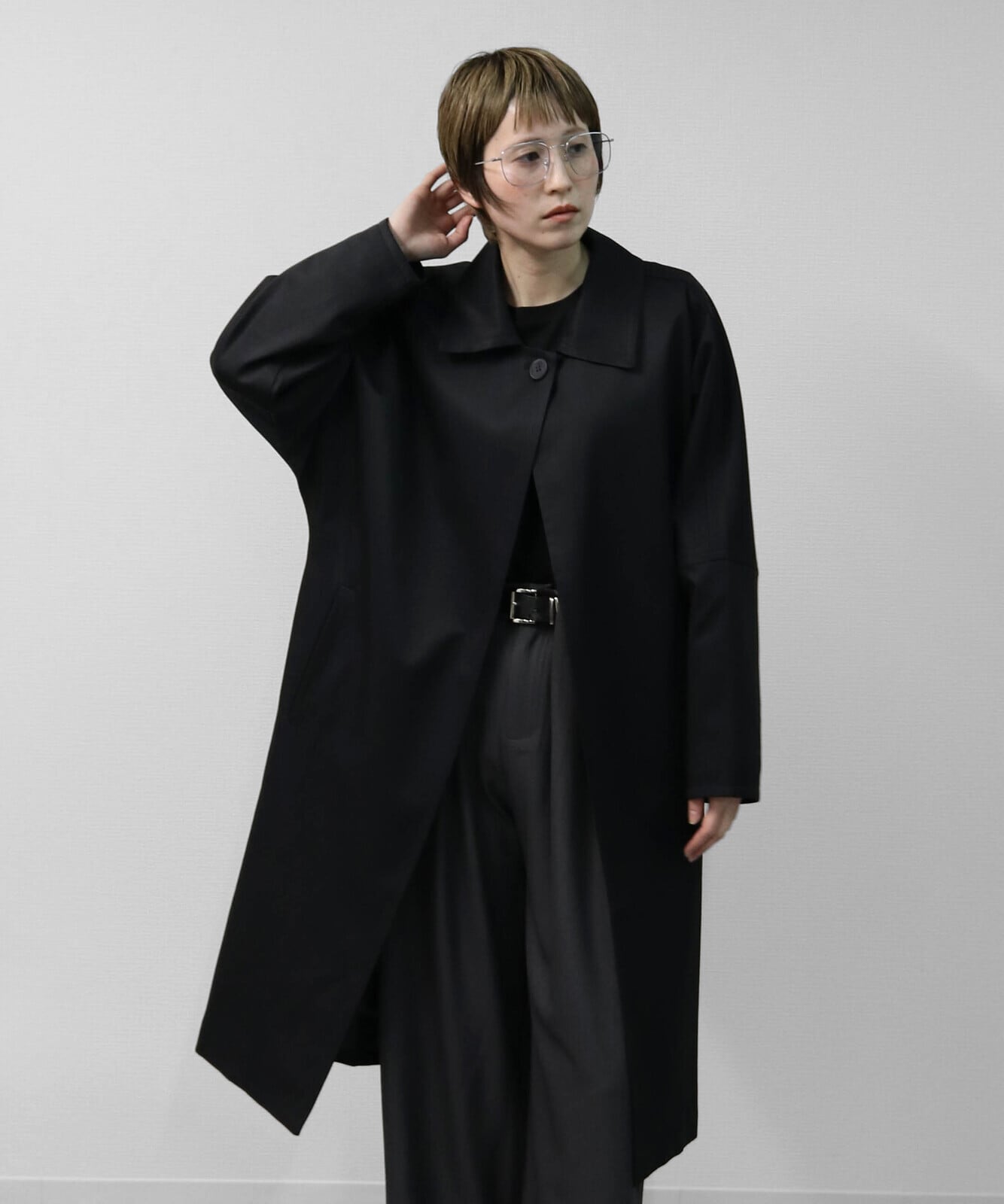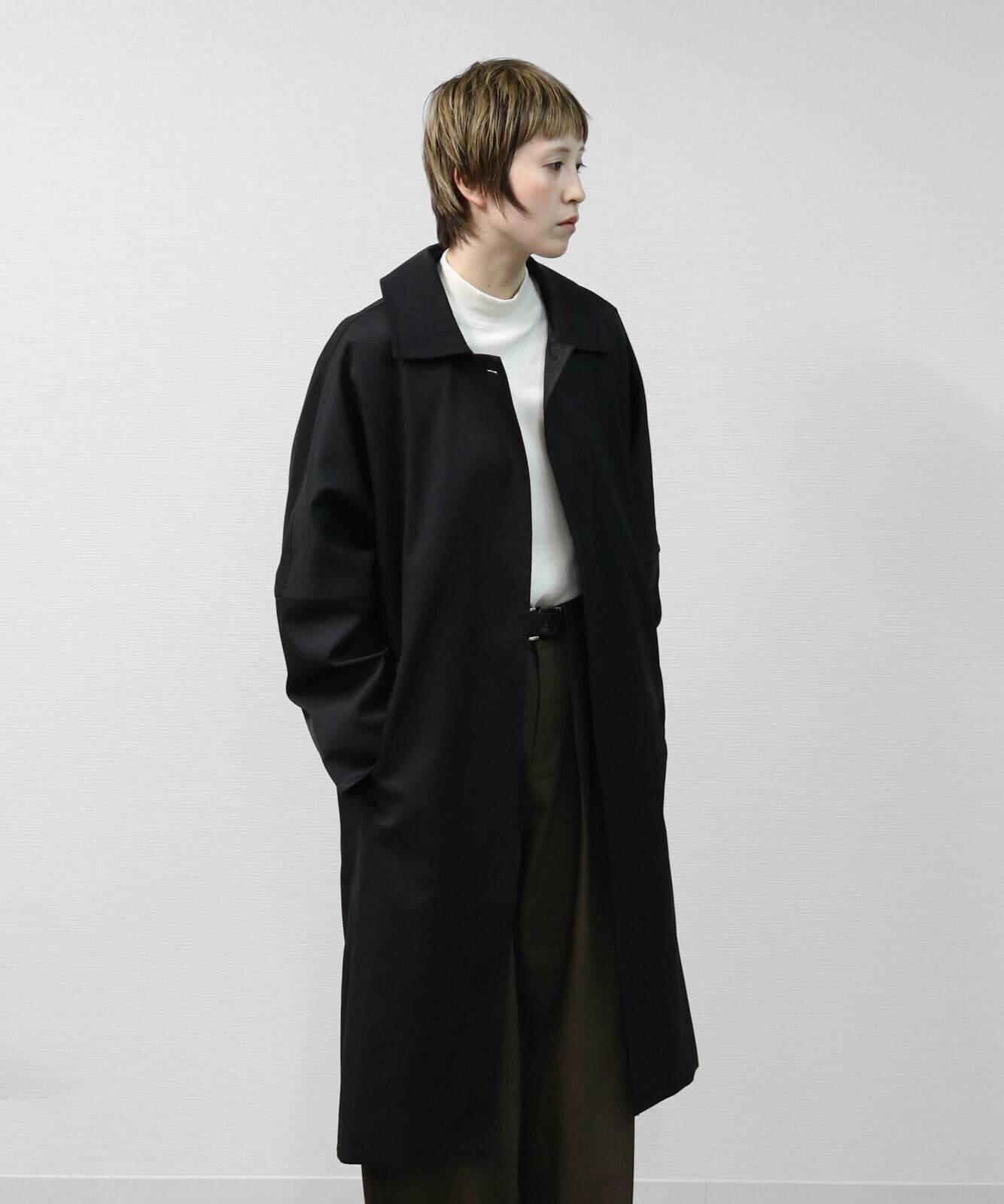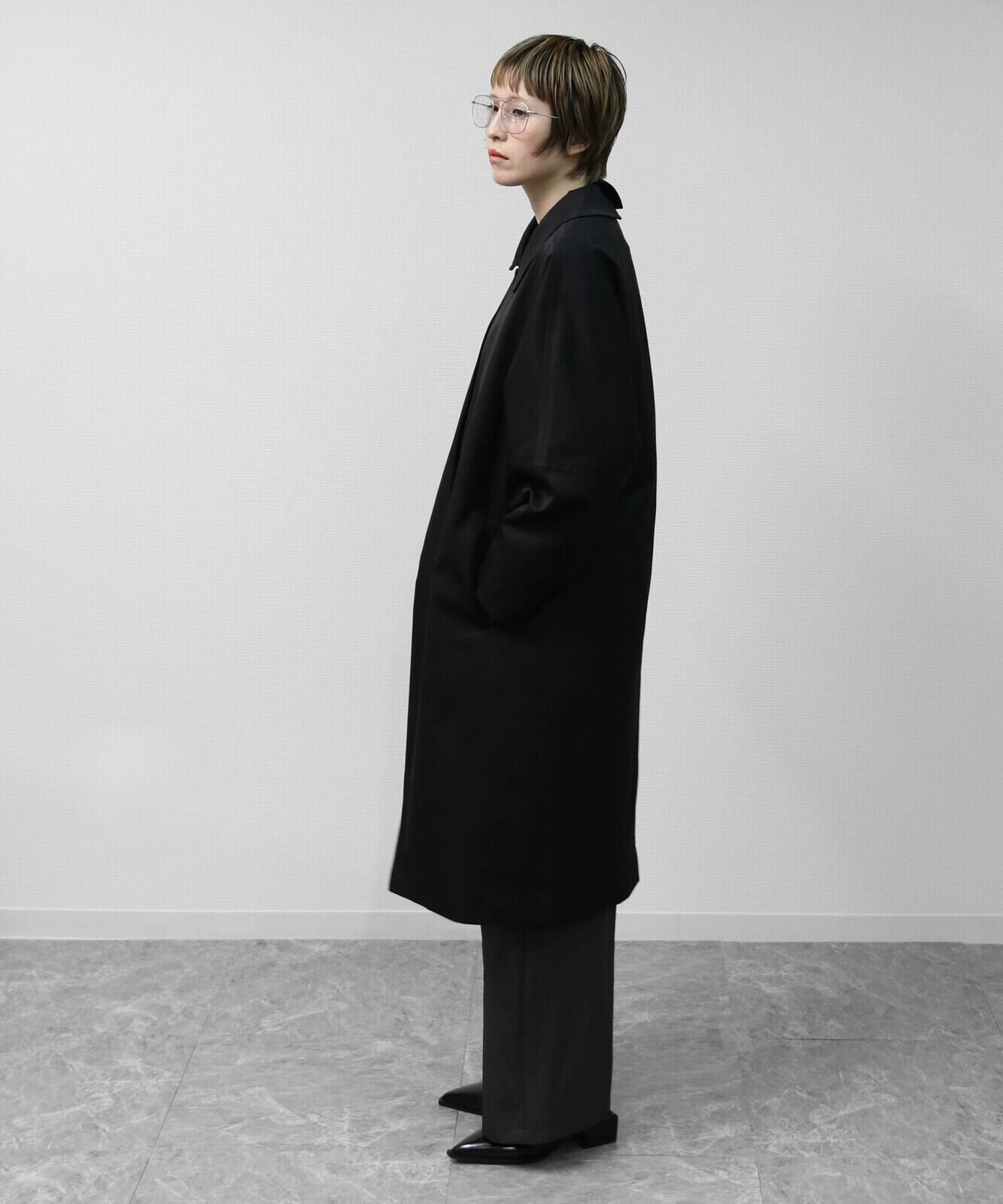 ゆったりとしたドルマンスリーブが生む立体感が、トレンチコートにやさしい表情を添えています。