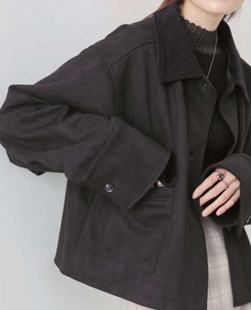 柔らかなフェイクスエードの表情に、襟や袖のコーデュロイがアクセントとなり、シンプルなシルエットにさりげない個性をプラスします。