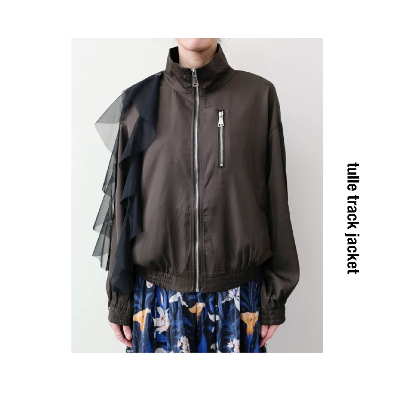 袖にあしらわれた大胆なチュールフリルが主役の一着。