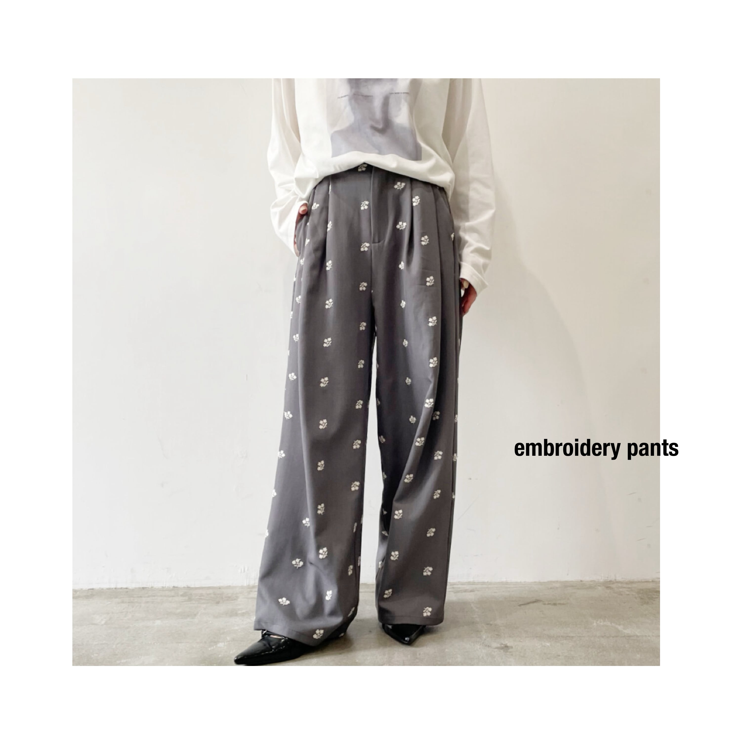 繊細なフラワー刺繍が目を引く存在感のあるTRタックパンツ