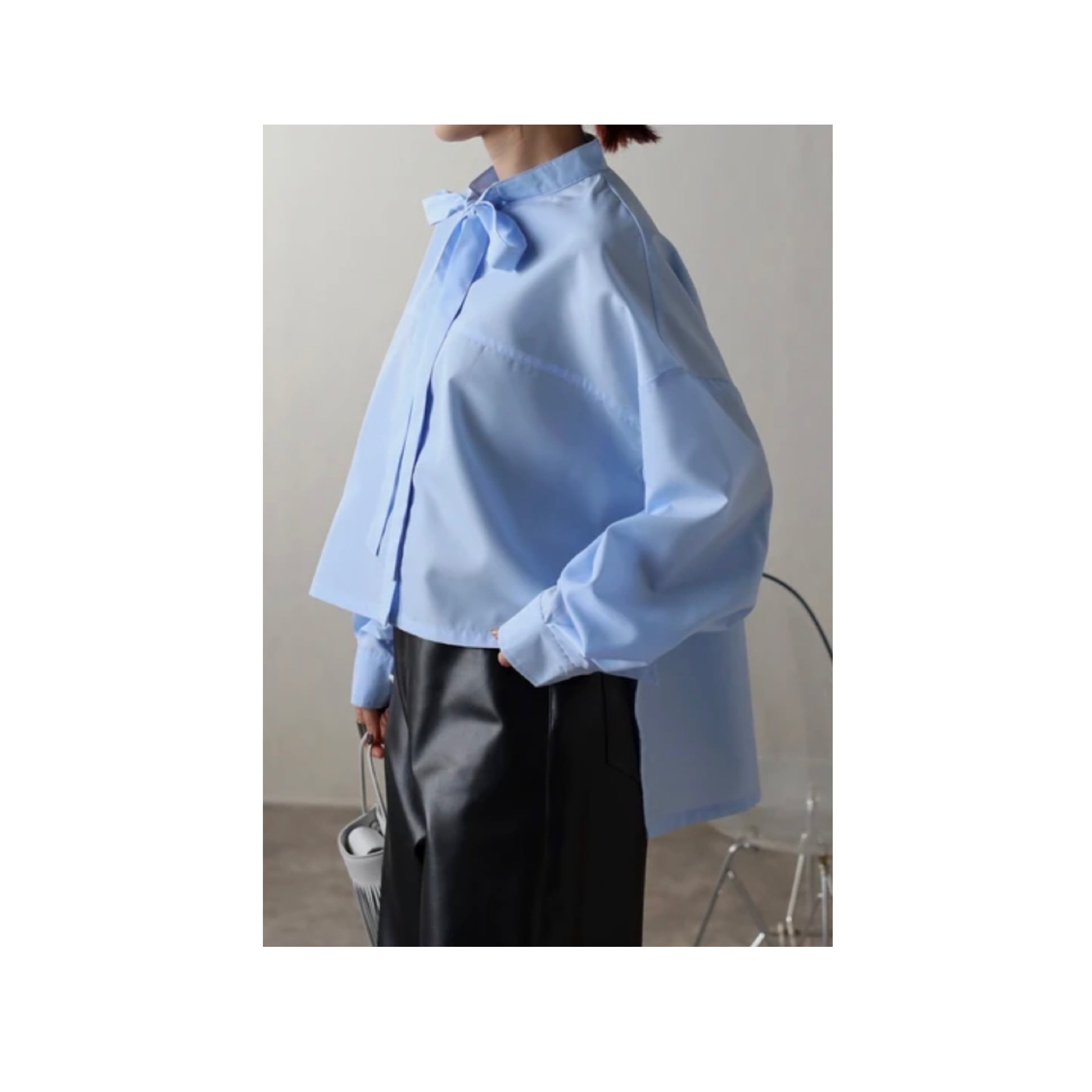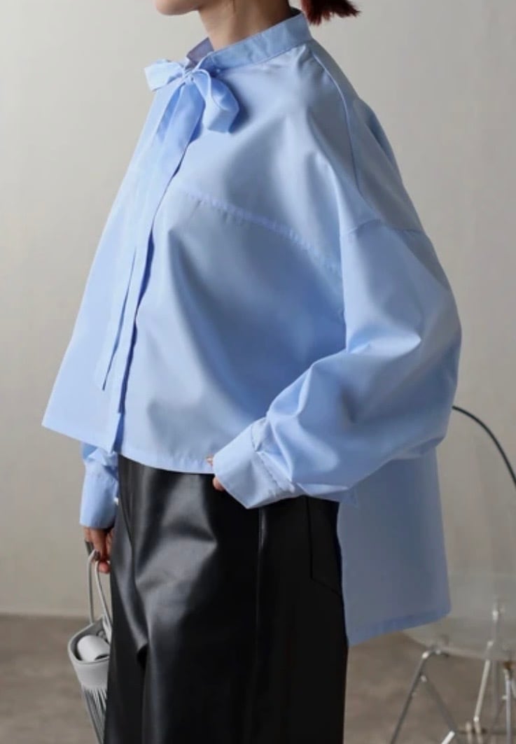 ネックのボウタイは、ひと結びで垂らしてモードな雰囲気にもリボン結びでフェミニンにもアレンジ可能。